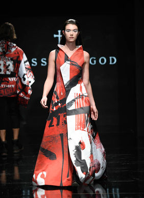 Opening the second night of L.A. Fashion Week was “Cross for God”, a line created by the well-known Taiwanese stylist Chuan Kao. Fashion influenced by the faith, the entire line is based on the Christian religion yet somehow managed to be one of the edgiest clothing designs presented at the event. Kao appealed to more than just our sense of sight by introducing her line with a live DJ set at the top of the show, making her the only designer to provide live music that evening. Drama and theatrical antics accompanied the show along with her bold choice to present a line of clothing clearly inspired by western religious leaders. Pulpit robes, also known as preaching robes, worn by men and women in colors of white, gray, and black were the highlight and closing looks for the show. Classic headpieces that could be seen worn by members of a church would have an urban touch to it with linings of gold and several angel wings were stitched to monochromatic looks: The Matrix meets the Vatican.